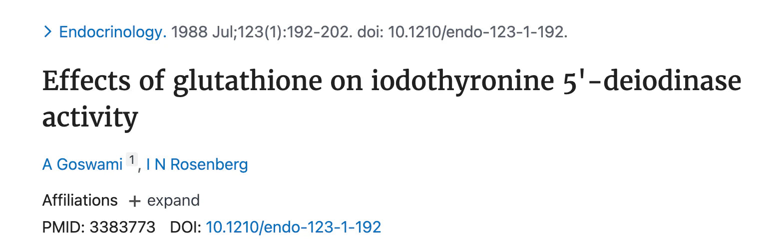 Effecten van glutathion op joodthyronine 5'-deiodinase-activiteit: https://pubmed.ncbi.nlm.nih.gov/3383773/