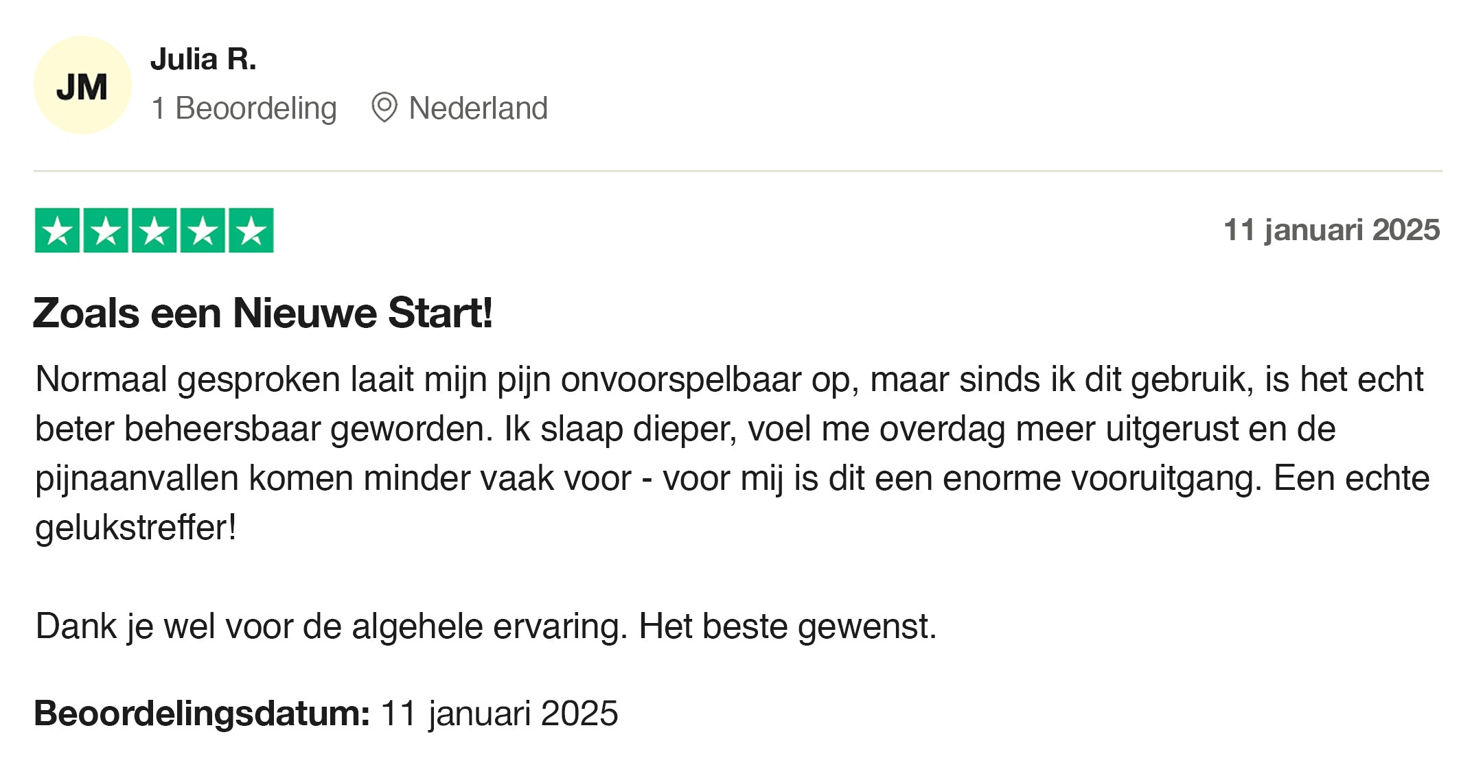 - Na 6–8 weken: Ik merkte dat mijn algemene pijnniveau afnam en mijn energieniveau consistenter werd. Geen wondermiddel, maar wel een merkbaar verschil.