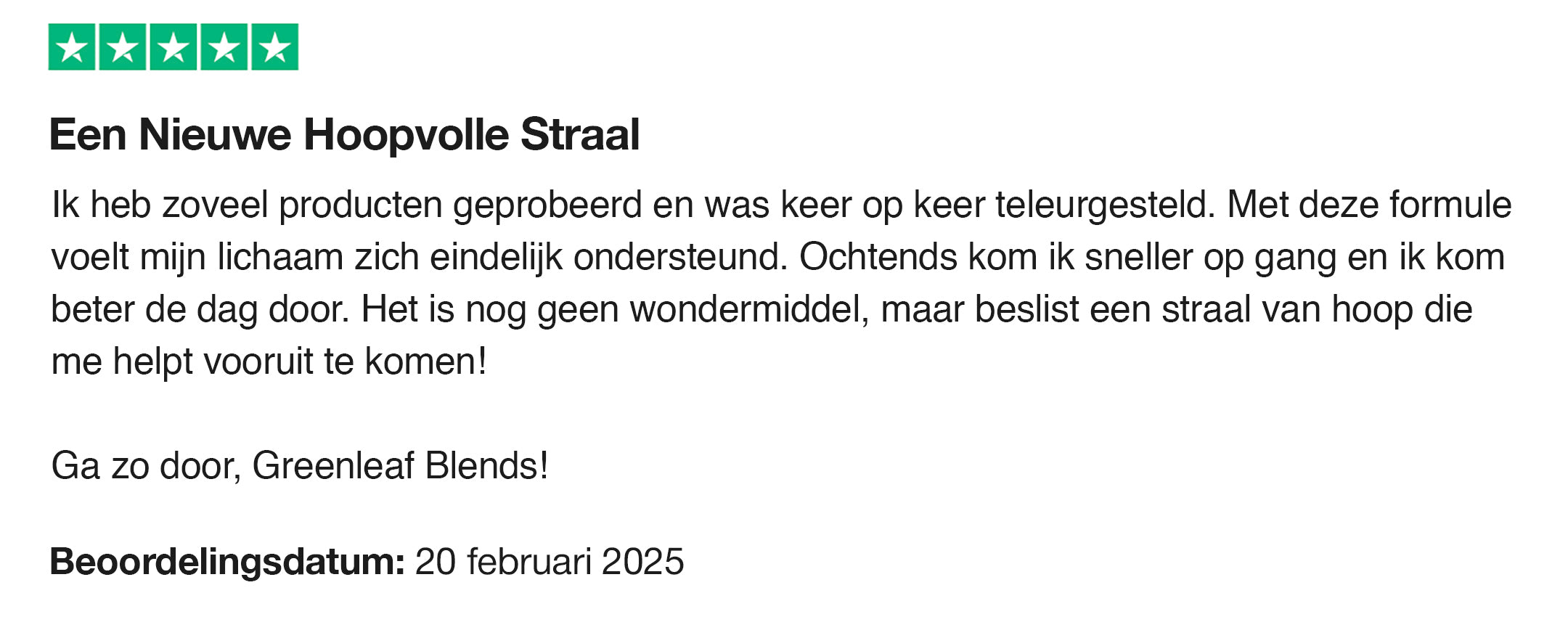 Ja! Greenleaf Blends biedt een 100% tevredenheidsgarantie. Als je niet tevreden bent met het product, heb je recht op een volledige terugbetaling binnen 60 dagen na aankoop, exclusief belasting en verzendkosten.