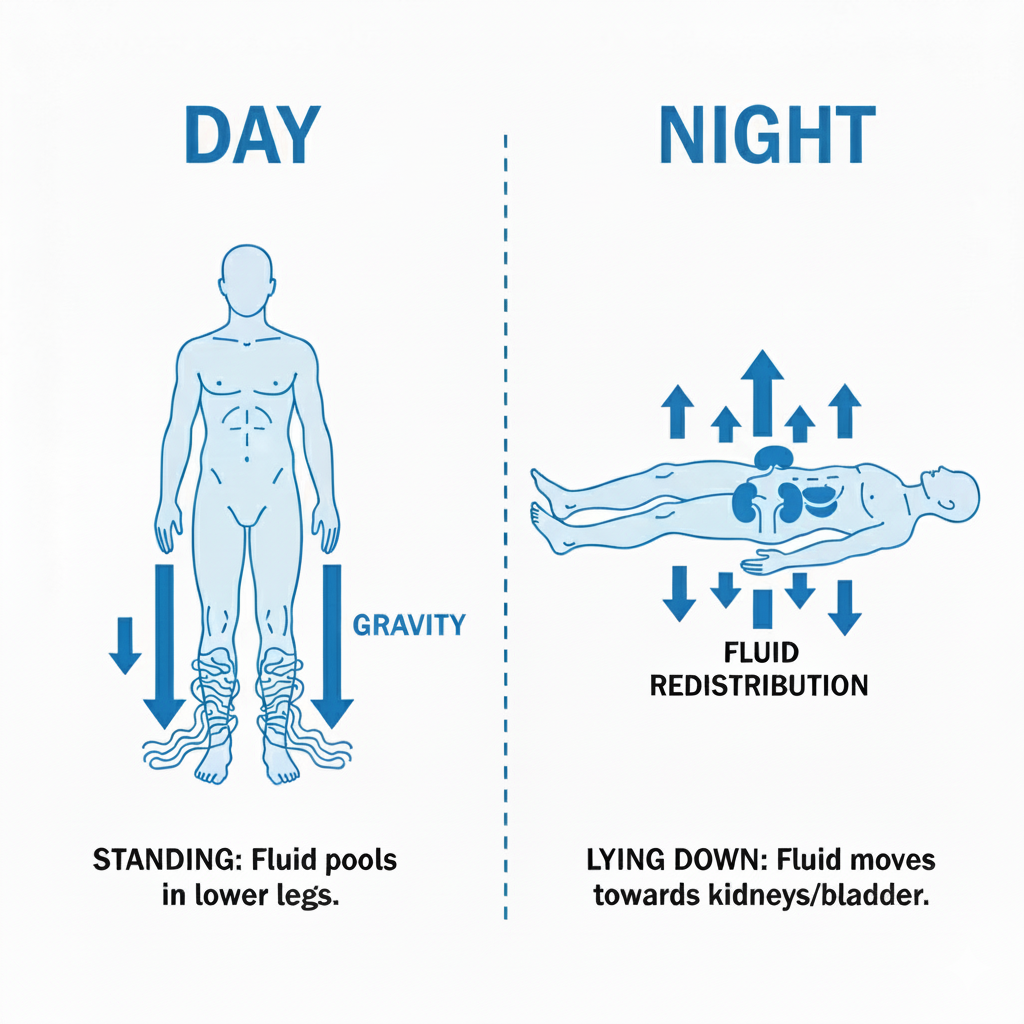 That trapped fluid redistributes. It moves from your legs, through your body, and into your kidneys and bladder.